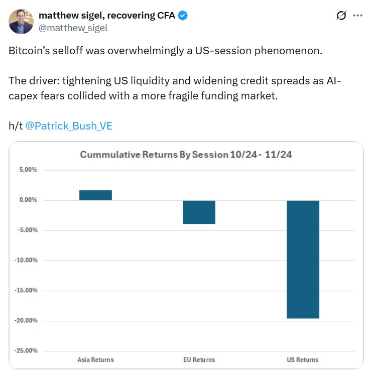 متیو سیگل، رئیس بخش تحقیقات داراییهای دیجیتال در وناک، سقوط اخیر بیت کوین را ناشی از فشار نقدینگی در آمریکا دانست. او گفت افزایش هزینههای سنگین سرمایهگذاری در پروژههای هوش مصنوعی و فاصله میان نرخهای اعتباری، بازار را به سمت موجهای فروش سریعتر سوق داده است. این شرایط نشان میدهد بخشی از والاستریت با محدودیت منابع مالی دستوپنجه نرم میکند.